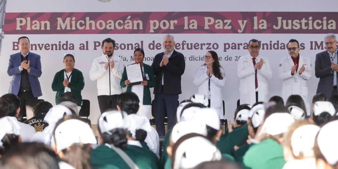 Morelia, Michoacán, 16 de diciembre de 2025.- El gobernador Alfredo Ramírez Bedolla y el director general del IMSS, Zoé Robledo Aburto, entregaron 270 bases a personal de salud, para reforzar los servicios que se ofrecen en las unidades médicas rurales y urbanas del Instituto Mexicano del Seguro Social en el estado, como parte del Plan Michoacán por la Paz y la Justicia.