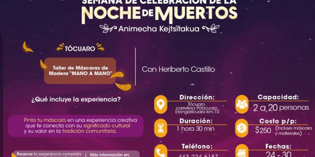 El costo por persona es de 250 pesos, cantidad que ya incluye el material, máscara y pinturas. El taller tiene una duración de una hora y media y se realizará en Tócuaro, en el taller del artesano ubicado en la carretera Pátzcuaro-Erongarícuaro kilómetro 10. Para más detalles, la Sectur Michoacán puso a disposición el teléfono 443 224 6187 y el sitio web https://visitmichoacan.com.mx/