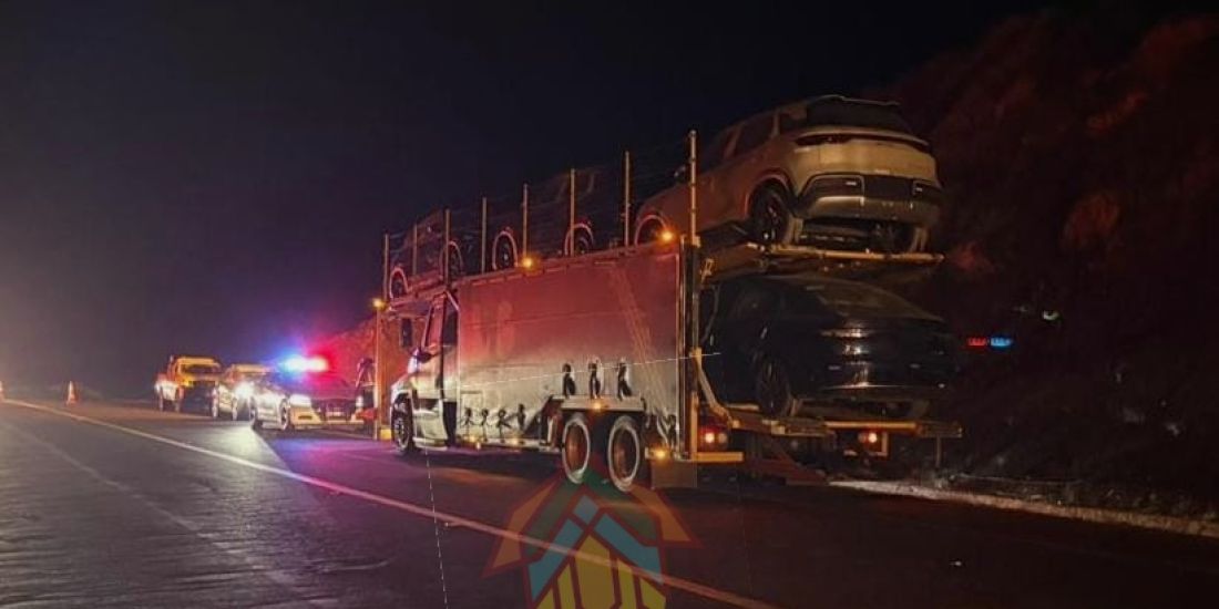 La Huacana, Mich.- 18 de diciembre de 2025.- Un voraz incendio consumió el segundo remolque de un camión nodriza, dejando calcinados 5 vehículos nuevos que eran trasladados en dicha unidad sobre la autopista Siglo XXI.