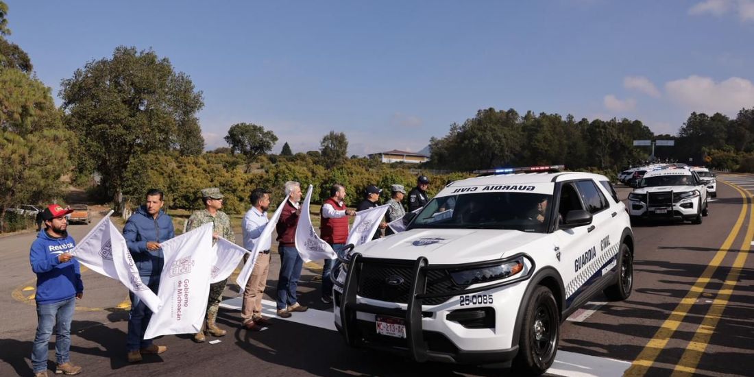 Zacán, Michoacán, 9 de enero de 2025.- Para reforzar la seguridad en el tramo carretero Uruapan-Peribán, el gobernador Alfredo Ramírez Bedolla en la comunidad con autogobierno de Zacán, puso en marcha el operativo Guardianes del Camino, integrado por Guardia Civil, Ejército Mexicano y Guardia Nacional.