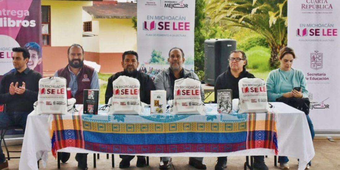 Morelia, Michoacán, 11 de octubre de 2025.- Integrantes del programa En Michoacán se lee, impulsado por la Secretaría de Educación del Estado (SEE), entregaron colecciones bibliográficas a representantes de siete telesecundarias del municipio de Pátzcuaro. La secretaria de Educación, Gabriela Molina, impulsa estas acciones que fomentan el derecho a la lectura en la comunidad educativa. Con esta entrega, más de 800 estudiantes de la zona 02 enriquecen el acervo bibliográfico de sus escuelas.