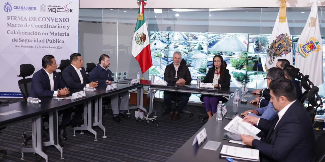 Silao, Guanajuato, 2 de diciembre de 2025.- El gobernador Alfredo Ramírez Bedolla y la gobernadora de Guanajuato, Libia García Muñoz Ledo, signaron convenio de coordinación y colaboración en materia de seguridad para reforzar acciones de prevención, inteligencia y operativos en municipios colindantes, carreteras y otros.