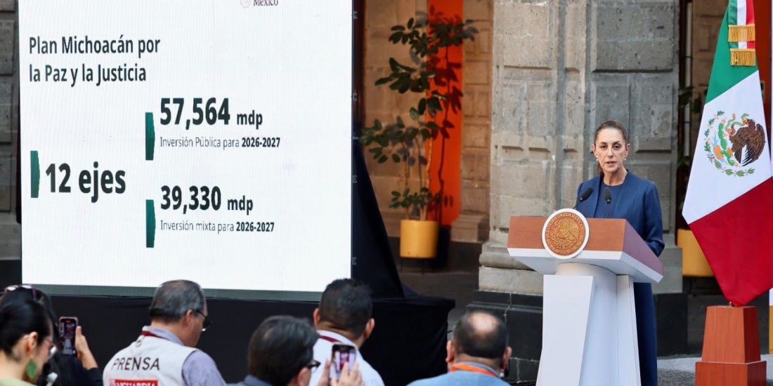 Ciudad de México, 9 de noviembre de 2025.- El gobernador Alfredo Ramírez Bedolla y la presidenta Claudia Sheinbaum Pardo presentaron el Plan Michoacán por la Paz y la Justicia, estrategia integral que contempla 57 mil millones de pesos del Gobierno federal y 2 mil 700 millones del Gobierno estatal para 100 acciones en 12 ejes como seguridad, justicia, salud, educación, infraestructura, desarrollo, entre otros rubros.