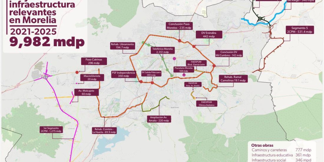 Detalló que dentro de las acciones de gran relevancia se encuentra el teleférico de Morelia; los distribuidores viales Eréndira y de la salida a Pátzcuaro; la construcción de los segmentos 1, 4 y 5 del segundo anillo periférico; así como el Paso Catrinas.