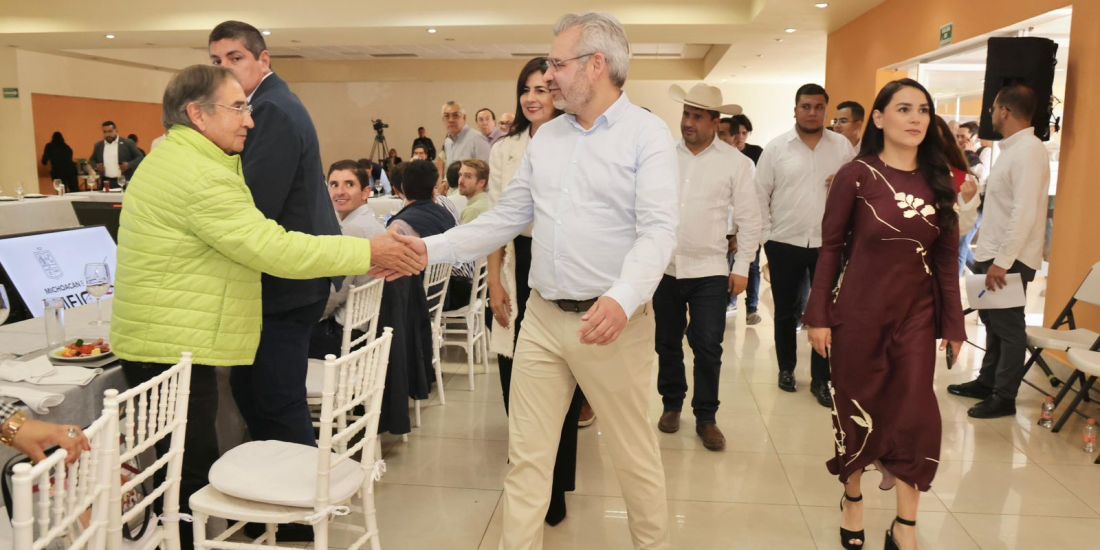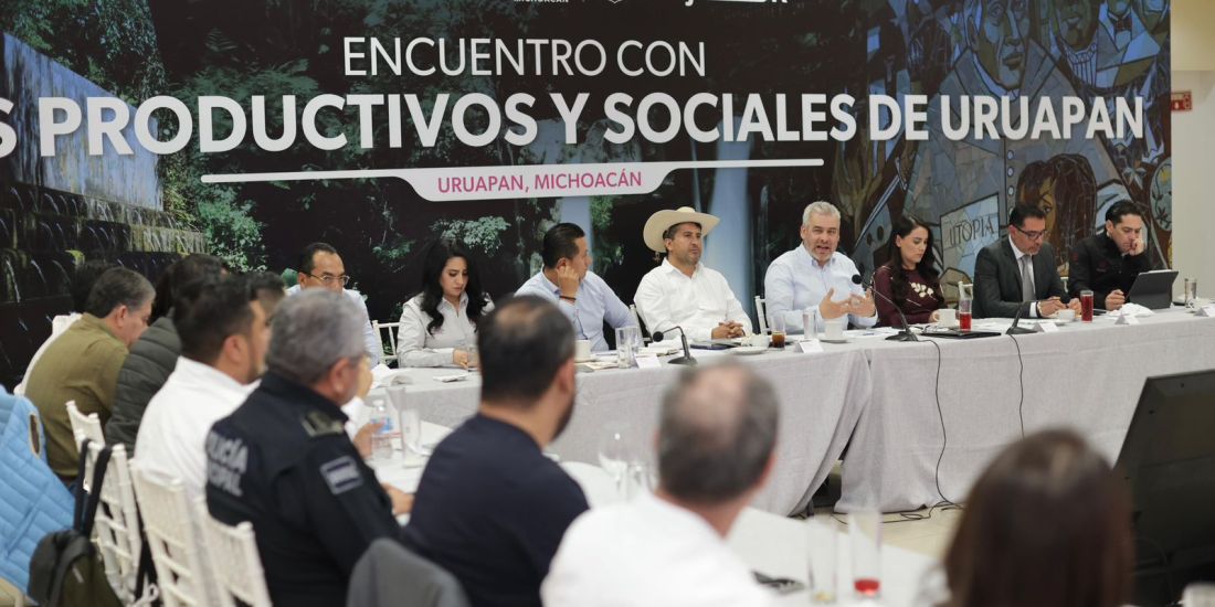 Uruapan, Michoacán, 26 de noviembre de 2024.- El gobernador Alfredo Ramírez Bedolla y representantes de las cámaras de industria, comercio y servicios, así como productores de Uruapan, acordaron reforzar acciones de desarrollo y preservación de la paz en la región.