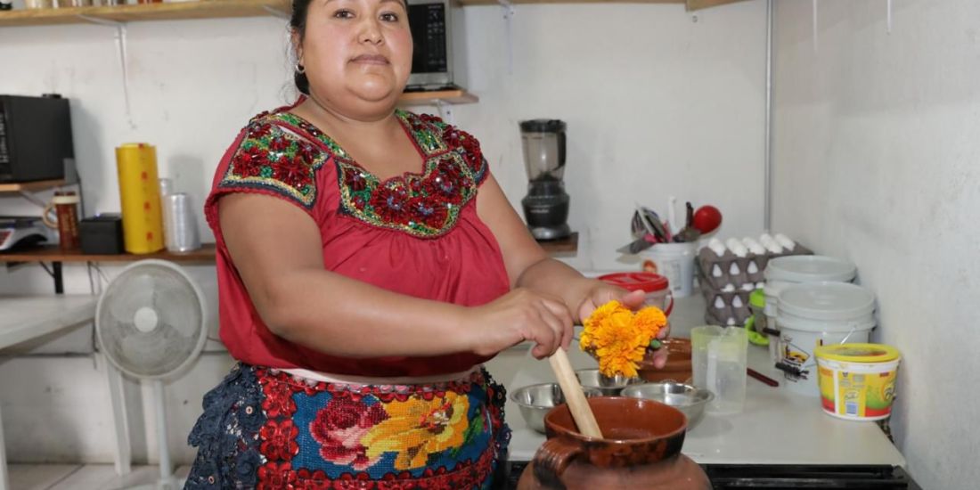 La guardiana de los sabores y saberes explicó que para preparar el atole se requiere de la combinación de la flor de cempasúchil, puskua (harina) de maíz, agua, leche, piloncillo y canela, todo se mezcla y se coloca al fuego en ollas de barro, las cuales dan un mejor sabor a los alimentos.