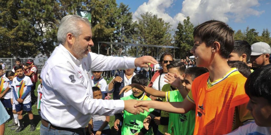 Explicó que el Gobierno estatal construye 41 canchas en 40 municipios, a fin de avanzar en el rescate de espacios públicos para que las niñas, niños y jóvenes puedan llevar a cabo actividades deportivas.