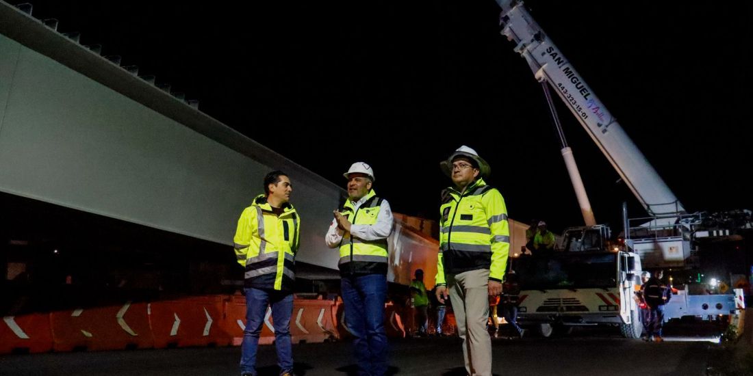 Morelia, Michoacán, 14 de marzo de 2025.- Durante la noche del jueves, el gobernador Alfredo Ramírez Bedolla supervisó la instalación de la última trabe metálica del paso superior vehicular Catrinas, en Villas del Pedregal. Con un avance significativo, la obra se encamina a su conclusión, faltando solo 47 días para su entrega.