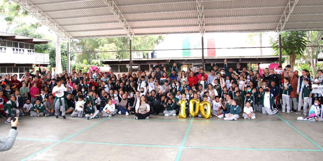 Morelia, 27 de noviembre 2023.- La Diputada Daniela De Los Santos Torres celebra con entusiasmo el logro alcanzado por el Programa Conectando al llegar a la marca de 100 escuelas recorridas en Morelia.