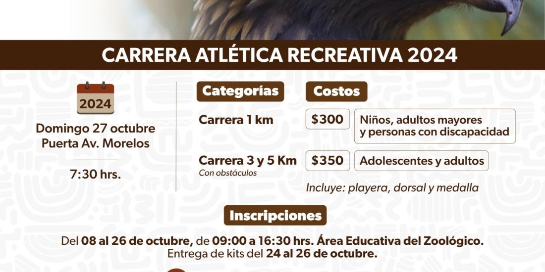 Morelia, Michoacán, 7 de octubre de 2024.- Por tercera ocasión, el Parque Zoológico Benito Juárez realizará su carrera atlética recreativa en beneficio de una de las especies más representativas de México, el águila real, la cual se encuentra en peligro de extinción.