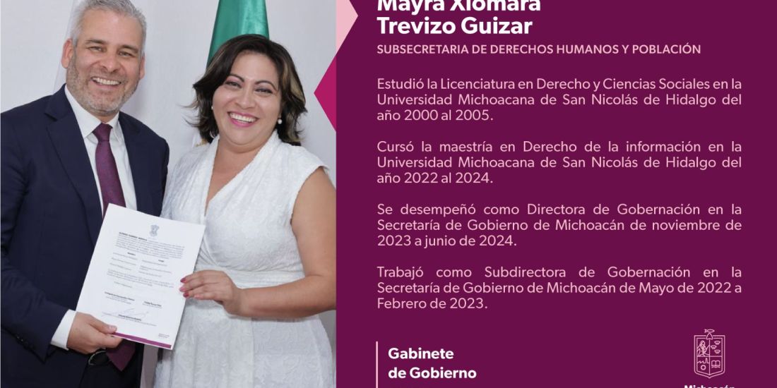 Asimismo, entregó el nombramiento a Mayra Xiomara Trevizo Guízar como subsecretaria de Derechos Humanos y Población. Ambos cargos dependientes de la Secretaría de Gobierno.
