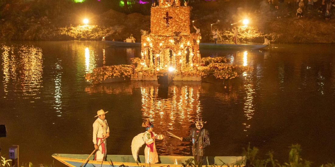 Pátzcuaro, Michoacán, 1 de noviembre de 2024.- Entre tradiciones, cultura, música y gastronomía, el espectáculo nocturno de canoas purépechas en los manantiales de Urandén, es uno de los imperdibles en esta Noche de Muertos.