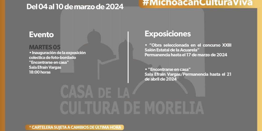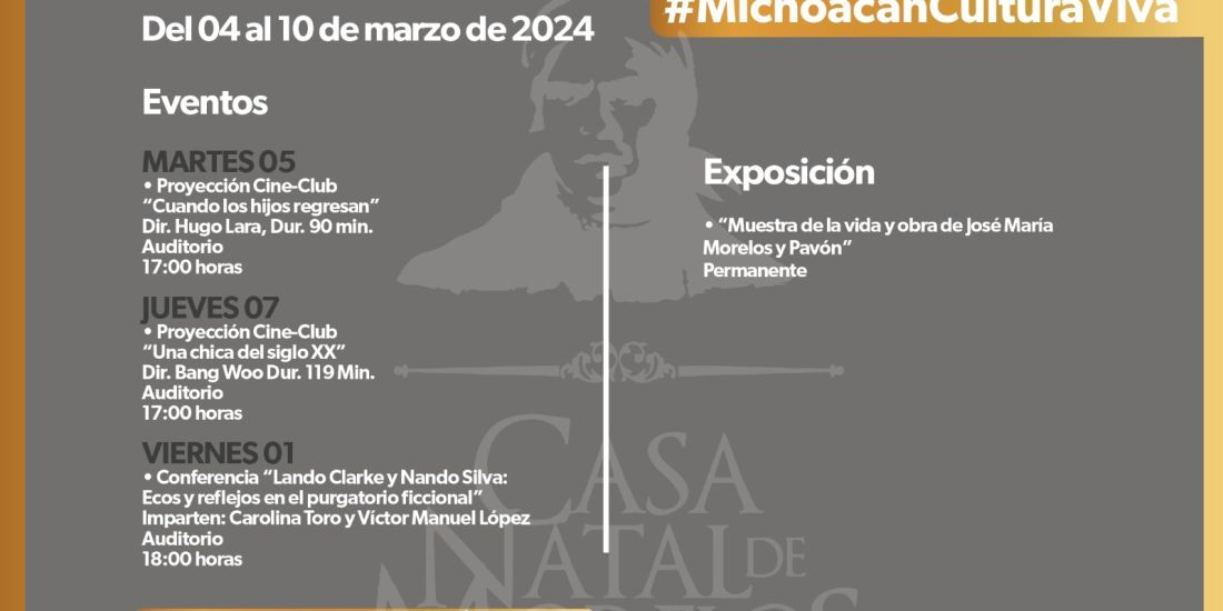 Morelia, Michoacán, 4 de marzo de 2024.- No te pierdas de una semana cultural en Michoacán del 4 al 10 de marzo. Habrá nuevas exposiciones, talleres, conversatorios, conferencias, proyecciones de cine y eventos especiales para conmemorar el Día Internacional de la Mujer.