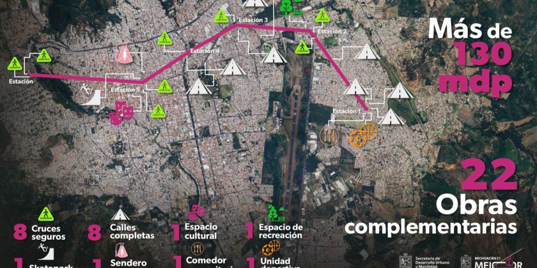 Entre las obras complementarias destacan ocho cruces seguros, ocho calles completas, un espacio de recreación, un skatepark, un sendero seguro, un comedor comunitario y una unidad deportiva.