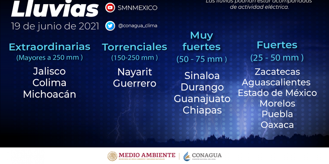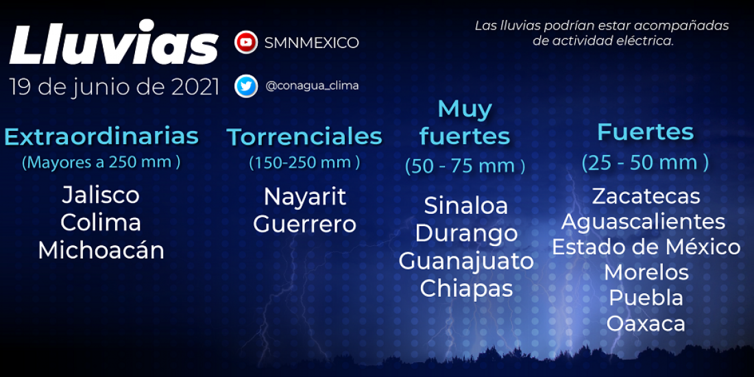 Durante las próximas horas, mantendrá lluvias puntuales extraordinarias (mayores a 250 milímetros [mm]) en Colima, Jalisco y Michoacán; puntuales torrenciales (de 150. 1 a 250 mm) en Guerrero y Nayarit, y lluvias muy fuertes (de 50.1 a 75 mm) en Durango, Guanajuato y Sinaloa.