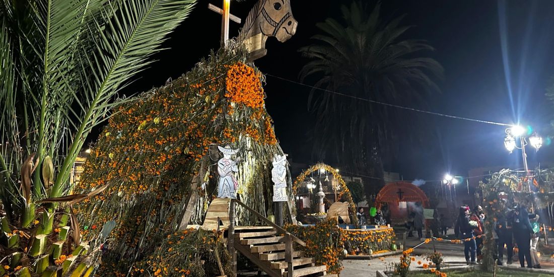 Mientras que en Cuanajo, en el municipio de Pátzcuaro, uno de los tres pueblos del estado en donde la comunidad lleva la ofrenda tradicional “montada” a lomo de caballos de madera. La entrega de ofrendas inicia a partir de las 21:00 o 22:00 horas del día 1 hasta las primeras horas del 2 de noviembre. Se distinguen las casas con “difunto reciente” porque las puertas están enmarcadas con arcos de flores de cempasúchil: la señal tradicional para que el difunto sepa distinguir el camino al hogar que lo espera.